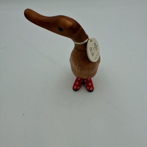 Dcuk and med blå gummistøvler forestiller en gås lavet af træ med en naturlig finish. Den har blå gummistøvler med hvide prikker. Træmaterialet giver en varm og rustik følelse.