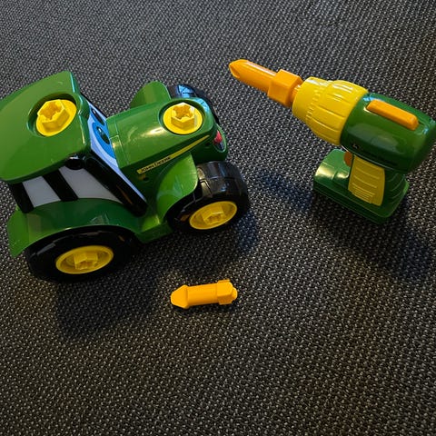 Traktoren er grøn med gule hjul og øjne. Den har tilbehør der ligner et værktøj.,Afhentes i:,Røde Kors Holstebro (661),Bemærk at mail, chat og beskeder ikke besvares, og varen skal købes på knappen "Gå til varen"