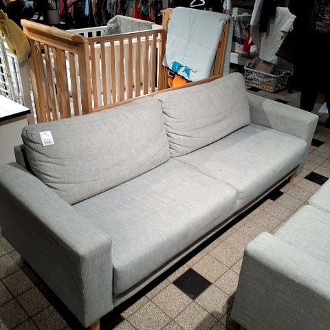 Sofa med bløde, polstrede sæder og armstøtter. Betræk i gråt stof og med træben,Afhentes i:,Røde Kors Tuborgvej / København NV (101),Bemærk at mail, chat og beskeder ikke besvares, og varen skal købes på knappen "Gå til varen"