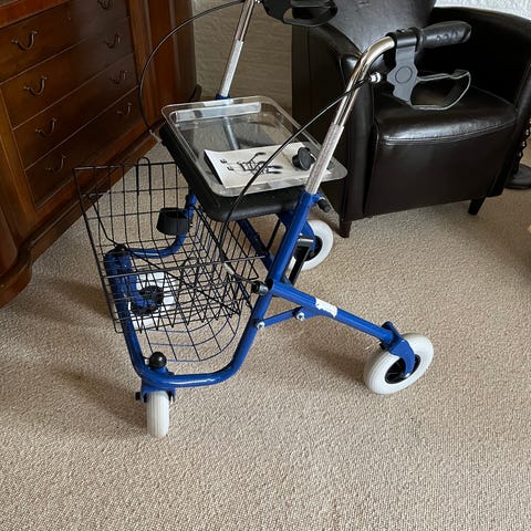 Næsten ny rollator brugt 3x. Er meget let og behagelig og køre især for ældre mennesker, ude og indendørs. Med reflekser.