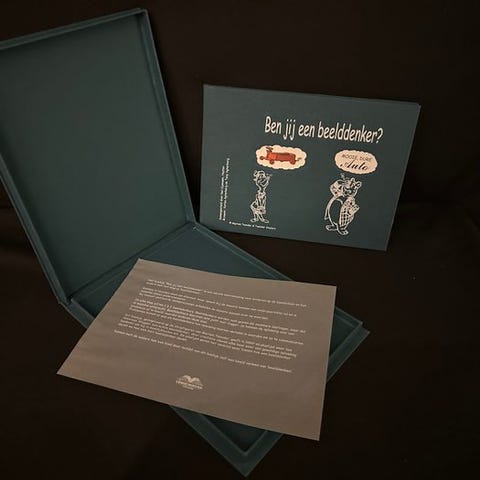 Denne nu til vejside afslørede, vidunderlige tryk er en høj kvalitet prøveudskrift til en publikation i 1970'erne. Sandsynligvis til bagsiden af den berømte Witte Bezige Bij pocketbøger. Prøveudskriften/trykket er blevet redigeret med hvid dækværf (retoucheringsmaling) på nogle steder, med sort tilføjet og fremhævet. Format på trykket; 9 x 11