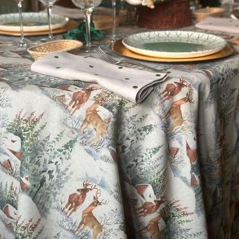 En dug til store borde, lavet af toile de jouy-stof med romantiske landlige motiver, fremstillet af en blanding af hør og bomuld med en tekstureret vævning, af exceptionel kvalitet. Denne udsøgte og elegante dug har en fyldig tekstur og komplementerer festligt service. Den er pletbestandig og viser ingen tegn på skader.