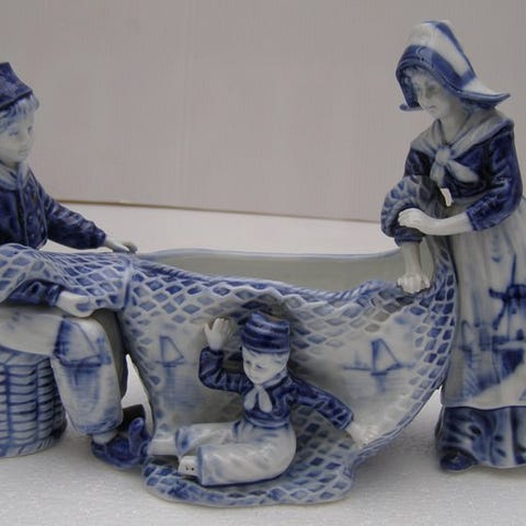 Der er en vintage messingplanter med blå og hvide Delft keramikhåndtag og løvekløfeet, en antik krukke med håndtag med gildeindskrift i bunden, en antik krukke, som muligvis har været en del af et møbel eller arkitektonisk element.