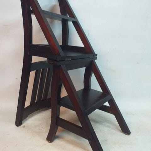 En meget flot trætrappe til biblioteket, meget godt håndværk, virkelig solid. Meget flot til hjemmet, godt vedligeholdt, sort på én trinde, se foto. Der er en skade, men det er ikke så slemt.