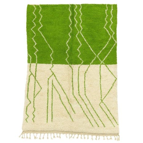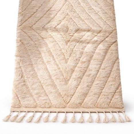 Tazrout er lavet af 100% blødt, naturligt uld med en solid bomuldsbund for ekstra holdbarhed. Den varme, cremefarvede nuance bliver smukt fremhævet af det solgule Berber-mønster, inspireret af beskyttelse, harmoni og samhørighed med naturen.
