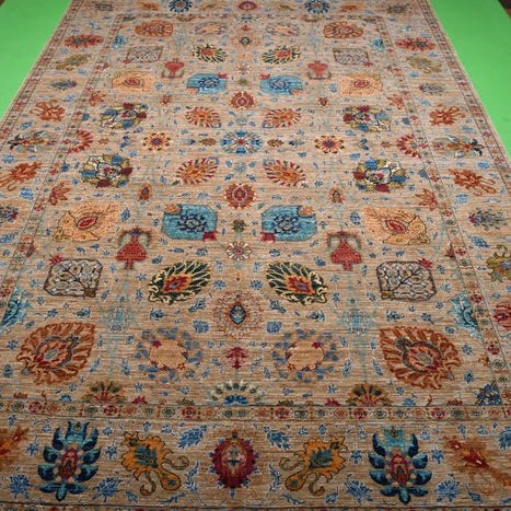 Et moderne designer tæppe (vintage) af uld på bomuld, oprindelse Pakistan, mål 407 x 298 cm, i meget god stand og professionelt rengjort. Klik på den blå "gå til varen" knap, for at købe eller byde på denne vare. Den samlede pris vil blive vist inden du afgiver dit bud.