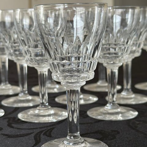 Et elegant og raffineret sæt på ti krystalglas, fremstillet i den berømte Mery Esneux-model af Val St-Lambert. Glasene udstråler en udsøgt glans og skimrende klarhed, karakteristisk for den højkvalitets krystalproduktion, som producenten er kendt for.