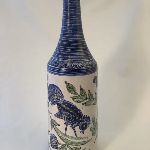 Designet har en udsmykket indgravering med geometriske og blomsteragtige motiver.