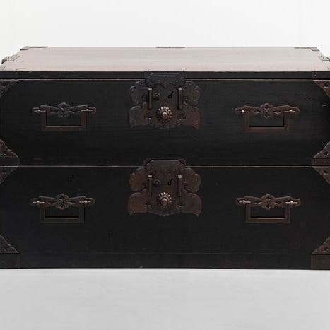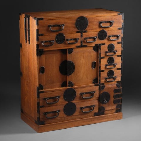 Et meget bredt butiksskabsudstilling fra det sene Meiji/Taishō-periode i Japan, 174,4 cm høj, 176,5 cm bred, 45,5 cm dyb, med hinoki-ramme og for- paneler i keyaki, Shunkei-rød lakering, øverste skydedøre af glas, nederste skuffer og skydedøre med gitter, jernafladningshåndtag, i fremragende stand og fuldstændig restaureret; certifikat for ægthed medfølger ved forsendelse. Klik på den blå "gå til varen" knap, for at købe eller byde på denne vare. Den samlede pris vil blive vist inden du afgiver dit bud.