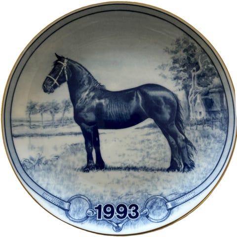 Flot blå platte fra Tove Svendsens serie af platter med hesteracer.