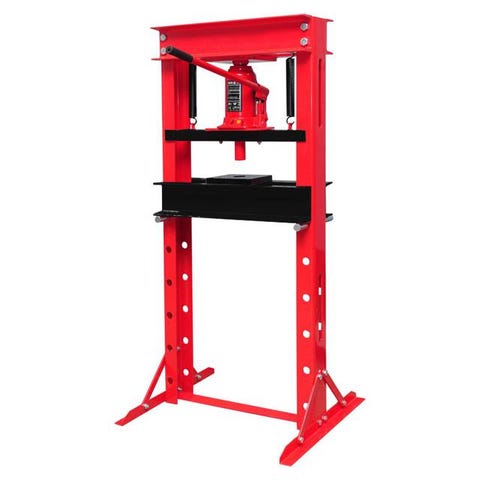Enkel værkstedspresse med 20 tons stempel og hydraulikpumpe. En god presse til de mere krævende opgaver. Max. kapacitet 20 t Arbejdshøjde: 0-730 mm Indstillinger af bordhøjde: 7 forskellige Stempelvandring: 160 mm Mål (L x B x H): 1410 x 700 x 550 mm Inkl. hydraulikpumpe Egenvægt: 72 kg Nr. 8003994 Se vores andre værkstedspresser her.