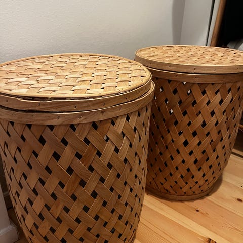Gammel svensk vasketøjskurv med 1 defekt håndtag 225kr. Store kurve med hank 125kr. Lille kurv med hank 75kr. Div små brødkurv 25kr stk