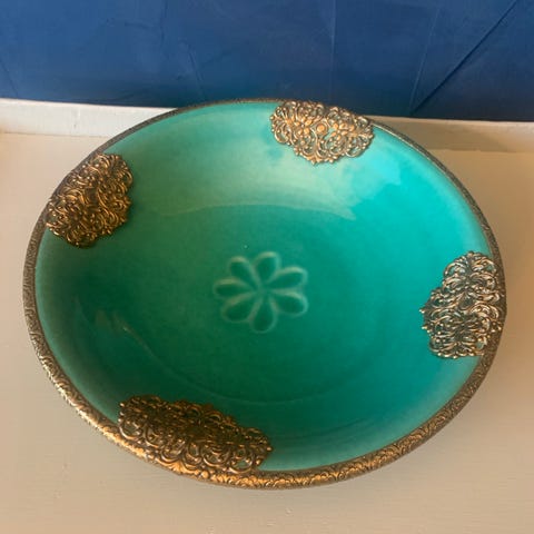 Flot skål fra den Kgl.+ 2 fyrfadsstager. Alt i fineste stand og ingen brændemærker i stagerne. Heller ingen skår. Sælges samlet for 500 kr