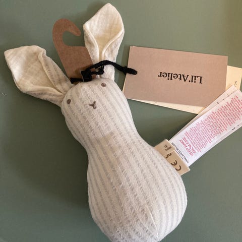 Rangle til baby i hvidt blødt materiale formet som et lam.