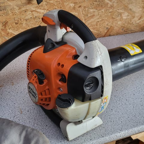 Stihl BG 86 C blæser med tilhørende støvsugerpose. Maskinen er designet til havearbejde og kan bruges til effektivt at blæse blade og andet let affald væk. Udstyret med håndtag for nem betjening og bærbarhed.