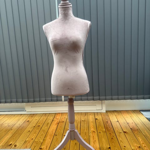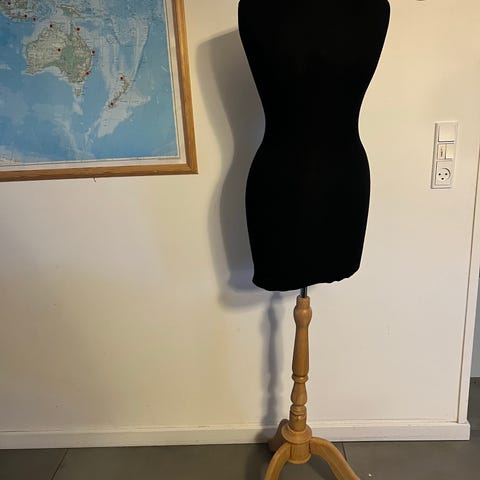 Justerbar sy mannequin i brun farve med metalstativ. Designet til at tilpasse forskellige størrelser for præcis pasform ved syning og tøjdesign.
