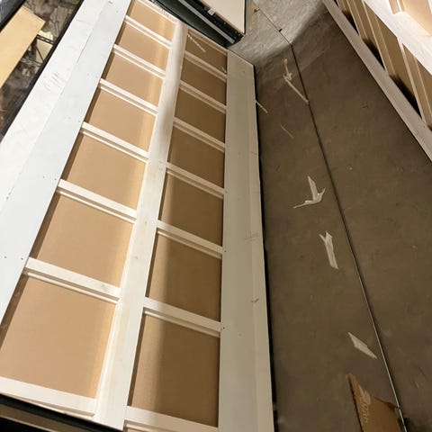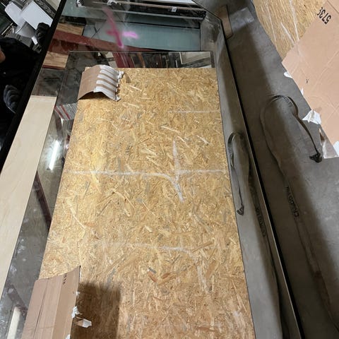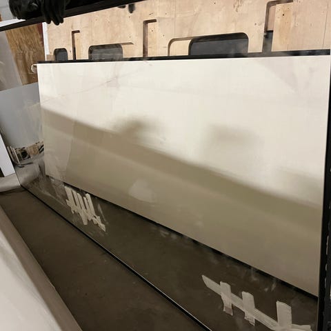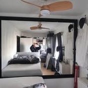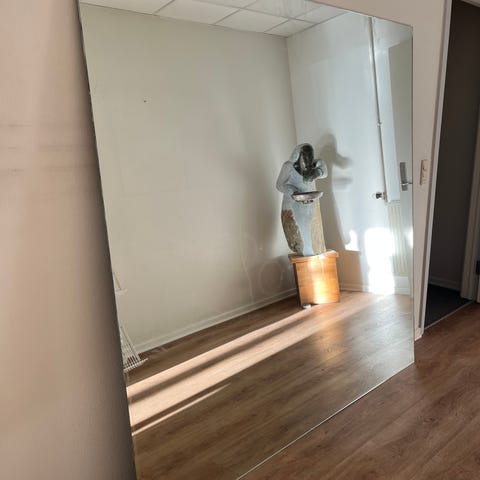 Stort spejl til væggen med træbeklædning bagtil. Spejlet er voldsomt tungt.