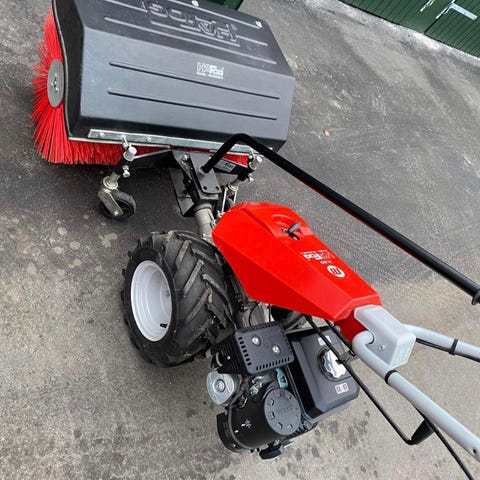 Nibbi AE14 redskabsbærer p. t. udstyret med 120 cm fejekost (Nye børster). Til maskinen hører også en kraftig sneslynge. Den kan udstyres med flere andre redskaber, hvis man lige kan finde dem!? Motoren er en 14 hk stabil og kraftig Lombardini A490 intermotor. Maskinen samt tilbehør er under renovering. Det, der er lavet, er blevet sandblæst og kold-galvaniseret. Perfekt maskine til det forhåndenværende og måske kommende vejrlig!