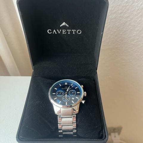 Cavetto Pantheon CV0002 er et ur, der kombinerer funktionalitet med et stilrent design. Med en diameter på 42 mm gør det et stærkt indtryk på håndleddet. Den runde urkasse har en metallisk finish, med en blå urskive, der tilføjer et strejf af elegance. Urskiven inkluderer tre kronografer, der tilbyder en praktisk og visuelt tiltalende detalje. Enkle lineære markører giver et rent udseende, som komplementeres af den sølvfarvede urkasse og bezel.