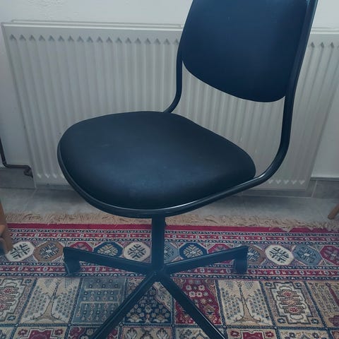 IKEA kontorstol i mørkegrå plast med sorte metal ben.