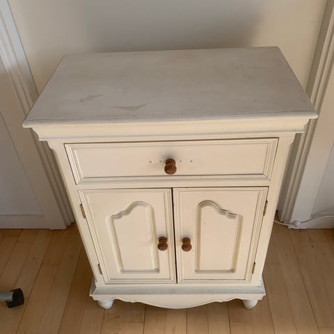 Fint skab med to skuffer og en låge med to hylder. Rigtig flot stenplade for oven. Fejler ikke noget.