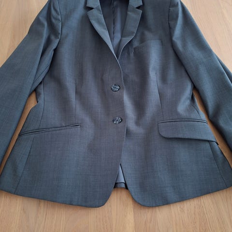 Tiger of Sweden Grå blazer i 90% Whool til kvinder i størrelse 36. Jakken har en klassisk pasform med to knapper og lommer foran. Materialet består af uld, hvilket giver god komfort. Velegnet til formelle og professionelle sammenhænge.