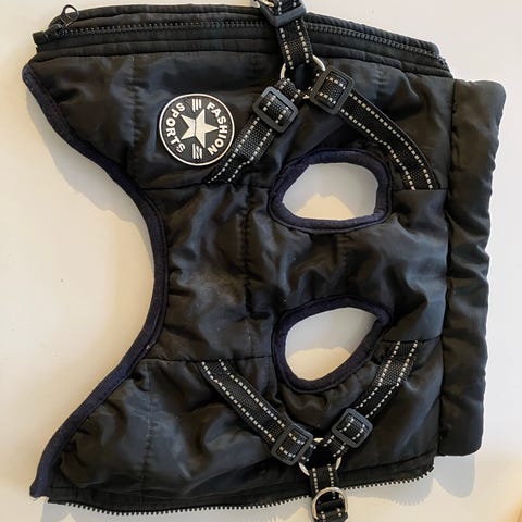 Størrelsen kan justeres ved brystet, i nakken, omkring maven og ved bagbenene. Se mål på de sidste billeder.