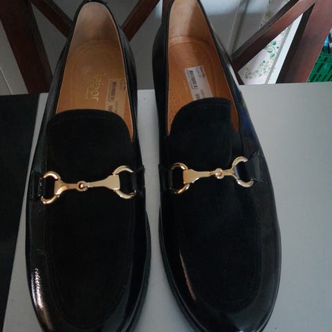 Sorte Gabor loafers. De er brugt en del, men kan stadigvæk sagtens bruges. Mit indtryk er at de er ret bløde at gå i, i forhold til andre loafers jeg tidligere har haft. De sælges da jeg ikke får brug for dem længere. De er i str 38; men jeg bruger normalt 39