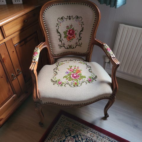 Antik stol og skammel med blomstret stof