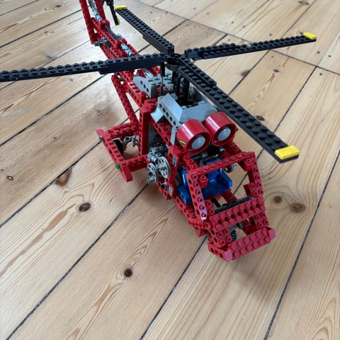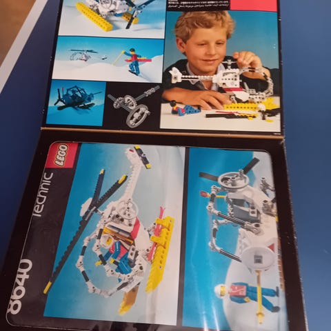 LEGO Technic byggesæt bestående af en helikopter og en bil. Sættene inkluderer detaljerede komponenter og manualer til samling. Egnet til samling og leg, med fokus på tekniske og mekaniske funktioner.