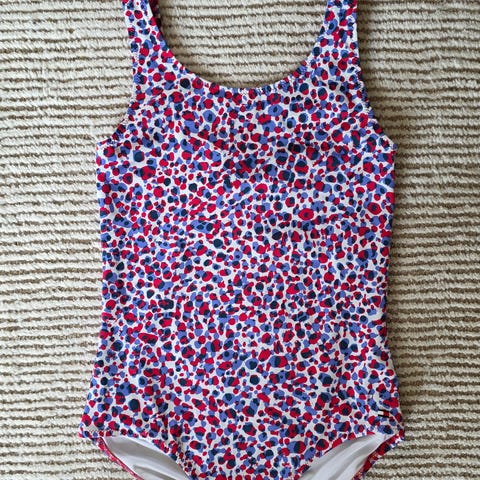 Den er str 146-152. Blå og hvid stribet. Den ene skulderstrop kan indstilles i længde.