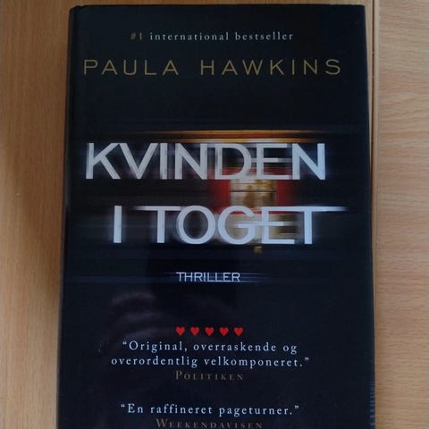 Paula Hawkins Kvinden i toget er en thrillerbog. Bogen indeholder spænding og mystik og er skrevet på dansk. Den er udgivet af Gyldendal.