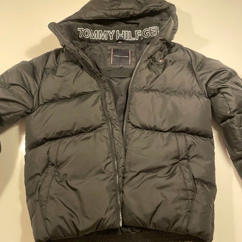 Tommy Hilfiger dunjakke i mørkeblå farve, størrelse L, som svarer til en dreng eller pige på mellem 160-180 cm høj eller 14-16 år. Jakken er fyldt med dun, hvilket giver isolering og varme og er rigtig dejlig at have på. Den har lynlås og lommer, samt inderlomme. Høj krave som gør det lunt og lækkert.