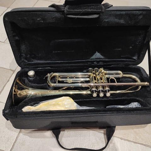 Trompet med sølvbelagt finish. Inkluderer etui, mundstykke, stander, mute og olie. Instrumentet viser tegn på brug og patina på overfladen.