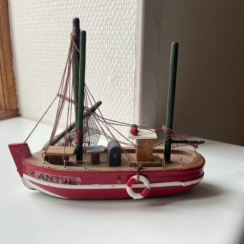 Gammel Odin træskib legetøj i træ med detaljer som rød og sort maling. Skibet har åbne vinduer og en bro, samt en sort skorsten med DSB-mærkning. Har trærulleben og triller perfekt. Så vil du have et stykke gammelt kvalitetslegetøj som supplement, så er dette måske noget for dig?