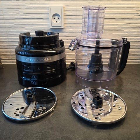 KitchenAid foodprocessor med flere skiver og knive til forskellige funktioner. Har gennemsigtig beholder med sort håndtag og base. Ledning med stik til strømforsyning. Velegnet til hakning, skæring og blanding af ingredienser.