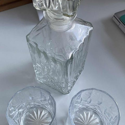 John McDonald Green Label glas whiskykaraffel med mønstret overflade og stop. Karaffelen har en kæde med mærkat, der angiver Old Scotch Whisky, 86 proof. Designet til opbevaring og servering af whisky. Højde cirka 20cm