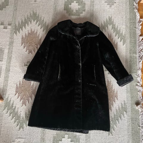 Flot rummelig frakke i sælskindspels med hætte sælges. Se alle billeder.