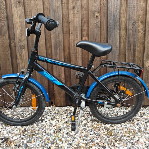 X-Treme Astro børnecykel med 16 tommer hjul, i farverne grøn og blå. Cyklen har støttefod, håndbremse for, fodbremser bag