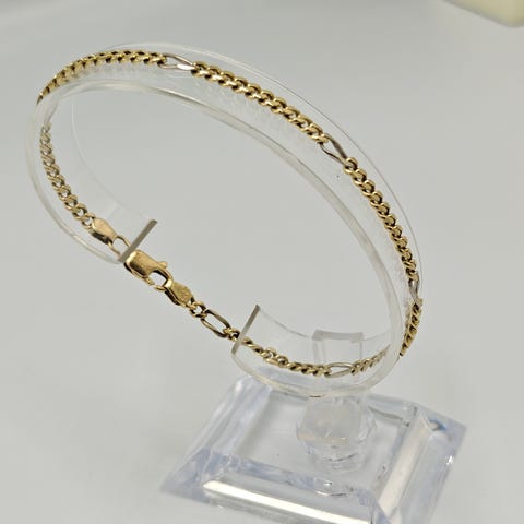 Guld armbånd med sten, 14 Karat. Den er stemplet, se billede og vejer 6 gram. Stenene er i forskellige farver. 2 stk er faldet ud. Trænger evt. til rens. Brugt. Salg for offentlig myndighed.