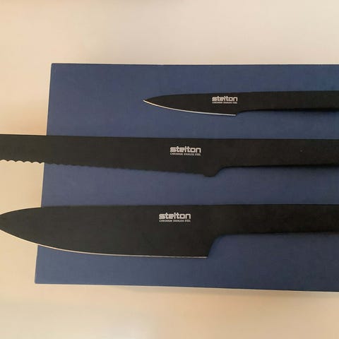 Stelton pure black knivsæt med 3 knive i sort stål. Knivene er i fin stand men brugt og trænger derfor til at blive slebet skarpe igen. Sælges samlet