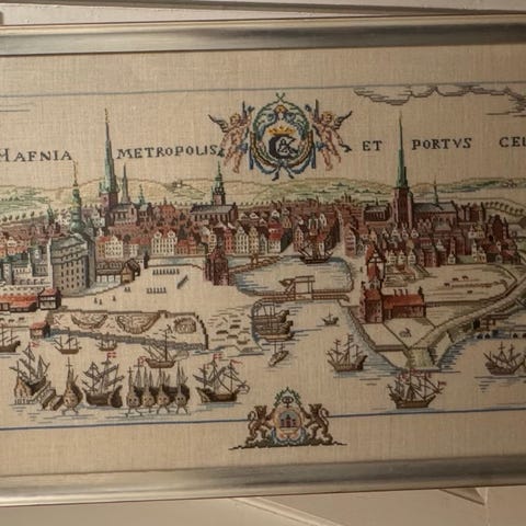 Korsstingsbroderi af Eva Rosenstrand. Hafnia med flag.