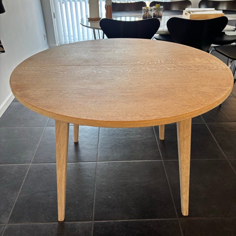 Pæn og velholdt rundt massiv egetræs spisebord med helt nye massive egetræs bordben. Ny slebet, har ikke fået olie i nu. Der medfølger to tillægsplader i egetræs finere , så den kan blive 220 cm lang