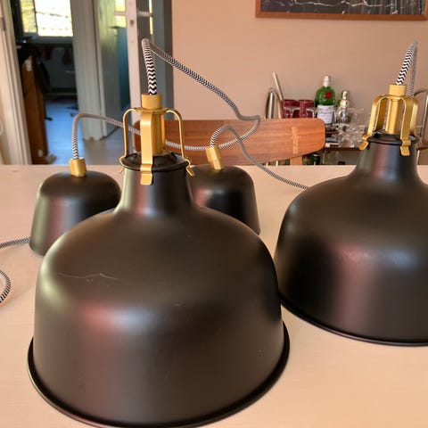 2 x BESTLITE pendler fra Gubi. Skærm i sort metal med krom ophæng. De originale loftrosetter mangler. Begge lamper er i fin brugt stand, med spor af brug hist og her (har forsøgt at affotografere små buler i skærmene).