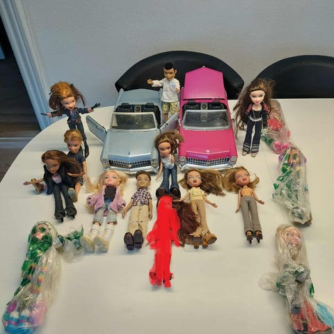 En masse Barbie og Bratz medfølgende tøj, sko, dyr, køretøjer og husting. Der er specialdukker i blandt og der er blandt andet en McDonald’s, en skole, Ariel’s verden og meget mere.