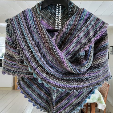 Strikket, trekantet sjal i meleret petrolblåt mohairgarn med ultra-diskret glimmer effekt. Tykt, men let og lækkert. Mål midt bag: 58 cm, længde 240 cm. Aldrig brugt, men kan f.eks fungere som vamset halstørklæde uden på frakke. Sender gerne