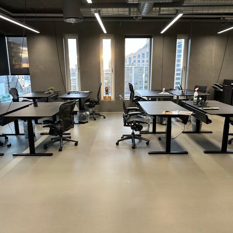 Komplet kontor setup for to (sælges samlet) - evt. til mindre virksomheder. Inkl. kontorstole, computerskærme, hævesænkeborde og skænk.