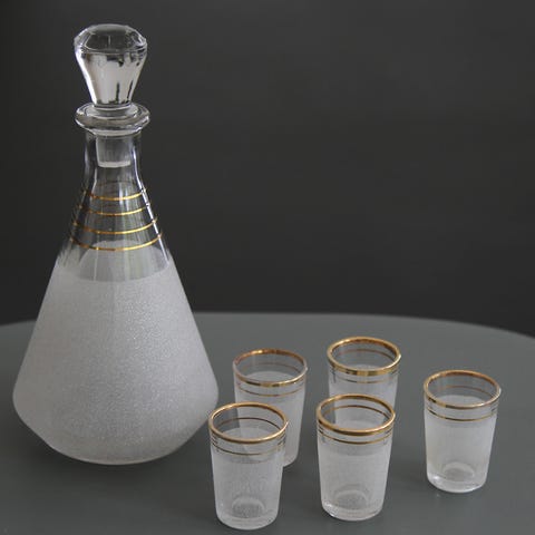 Mundblæst karaffel i blå farver med gulddekorationer i venetiansk muranoglas med gulddekorationer og proppen til karaflen er guldfarvet som dekorationerne. Elegant til velkomstdrinks eller som vandglas på det veldækkede bord