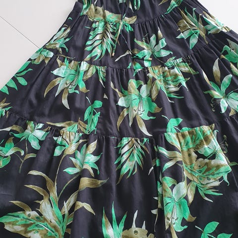 Den er str 14( 42), men af mig ændret til str 38, ved et pænt udført læg bag. Se foto. Den måler 78 cm i taljemål, og er 80 cm lang.