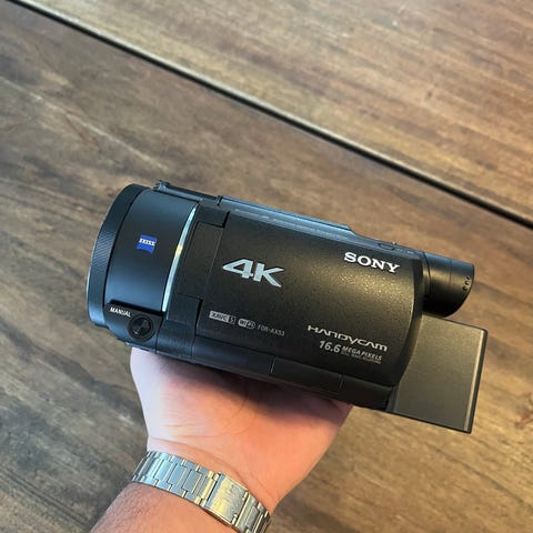 Sony Handycam videokamera med 42x optisk zoom. Kameraet har båndoptagelse og er designet til håndholdt brug. Produktet inkluderer en bæresele og en beskyttende taske til opbevaring og transport.